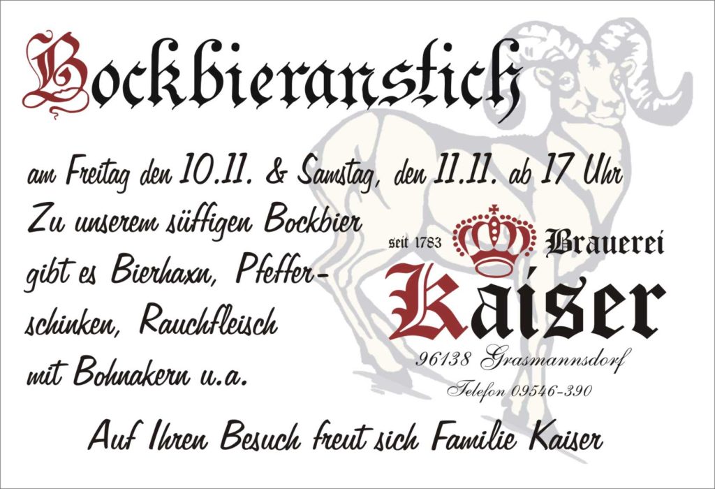 Es ist wieder so weit: Am Freitag und Samstag (10./11.11.2023) ist ab jeweils 17 Uhr Bockbieranstich bei der Brauerei Kaiser in Grasmannsdorf. Zum süffigen Bockbier werden herzhafte Speisen wie beispielsweise Bierhaxe, Pfefferschinken, Rauchfleisch mit Bohnakern u.a.