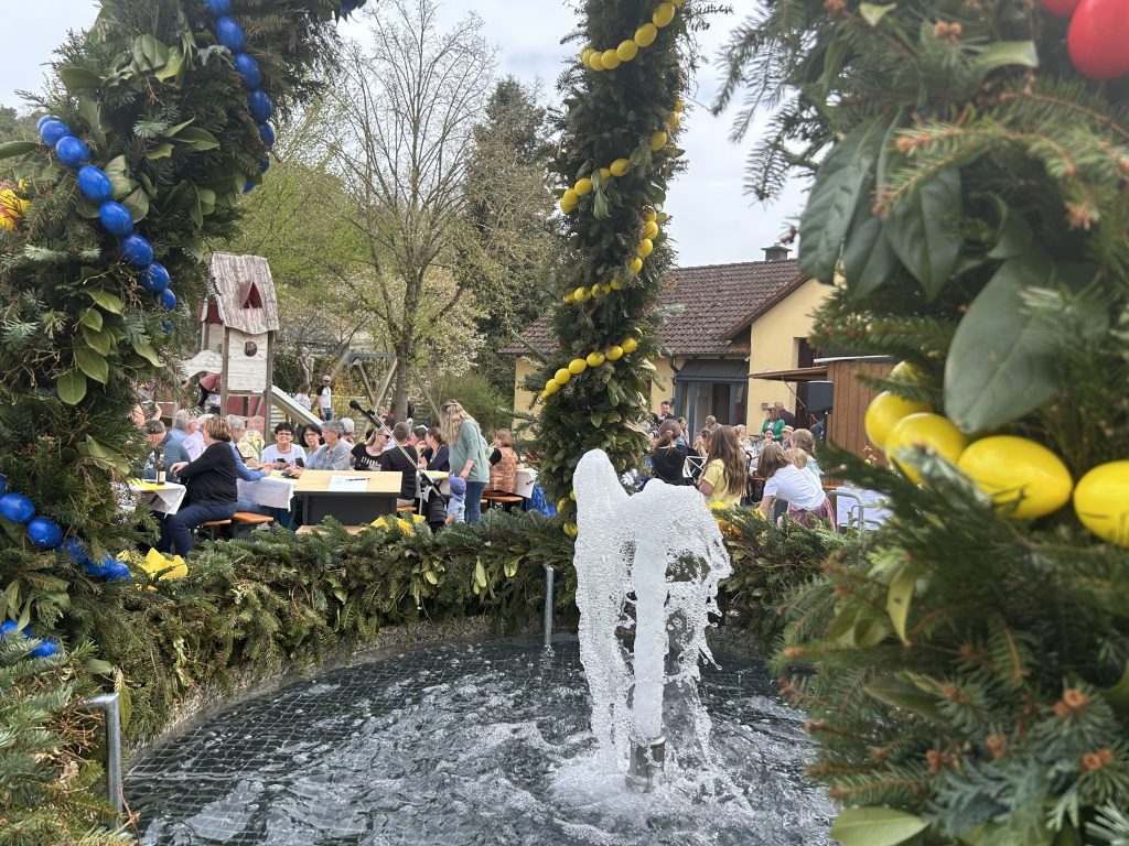 Bernd Bayer bedankte sich namens der Dorfgemeinschaft für die Realisierung des Brunnens und „des schönen Dorfplatzes“ bei allen Beteiligten mit kleinen Präsenten. Hinter Platz und Brunnen liege eine „bewegte Geschichte“ und man konnte von Anfang an mitsprechen, hob er hervor. Er dankte dann Anja Zürl und Theresa Mirsberger, die den Brunnen als Osterbrunnen geschmückt hatten mit dem vom Daniel Dollinger gefertigten Gestell. „Boris und Hans“ wiederum trugen maßgeblich dazu bei, dass das vor 32 Jahren errichtete Feuerwehr- und Dorfgemeinschaftshaus nun in neuem Glanz erstrahlt.