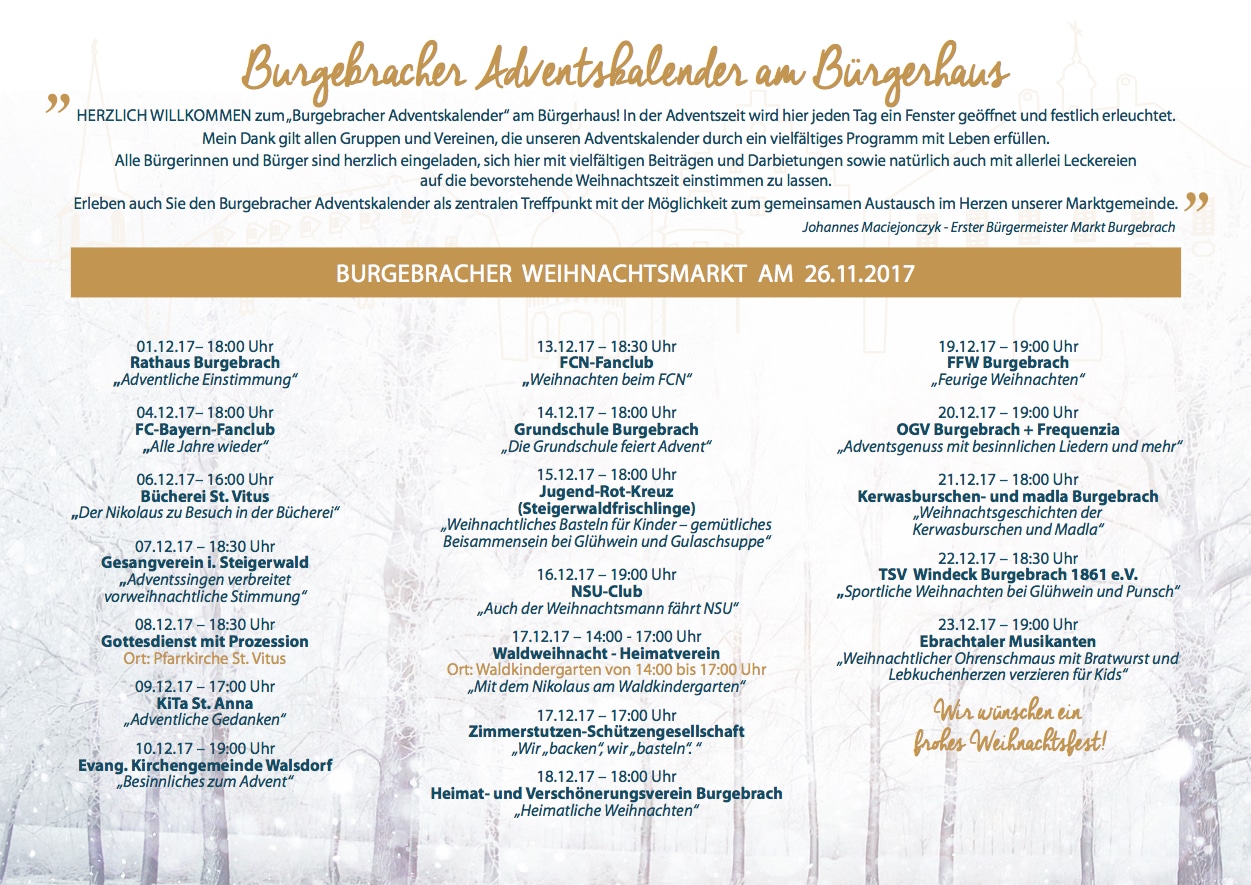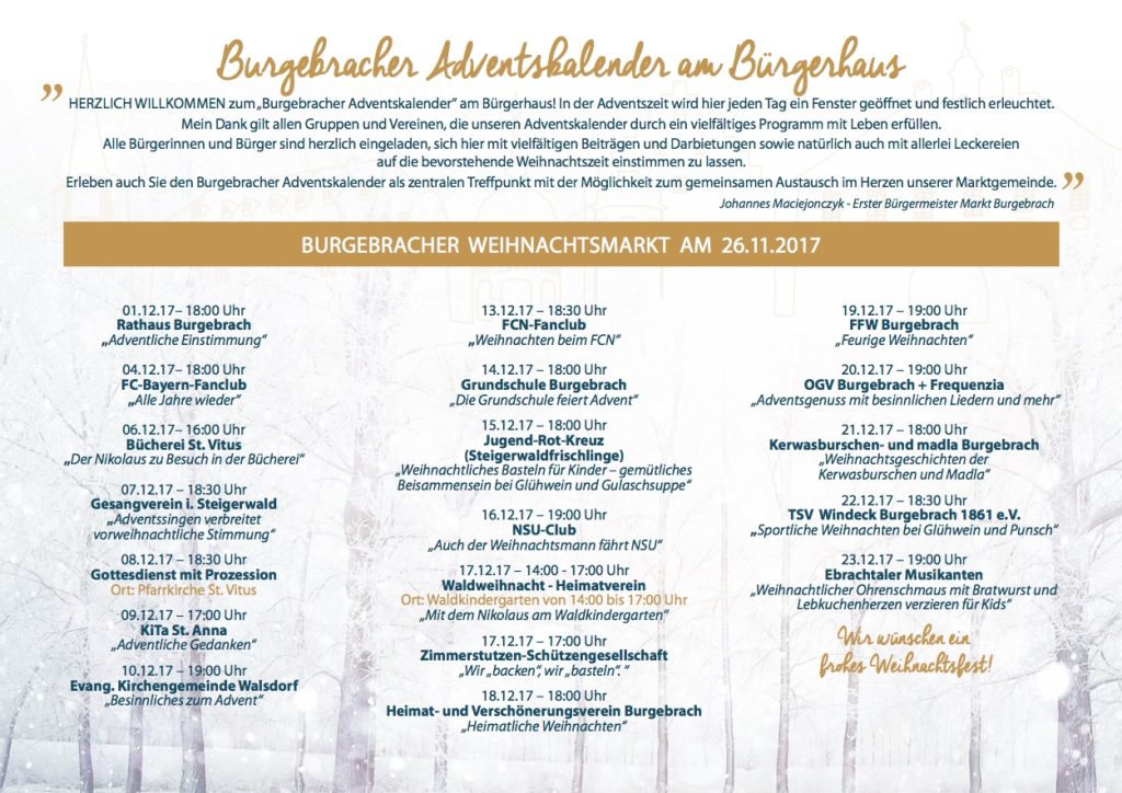 Unter dem Motto „Adventliche Einstimmung“ startet am 1. Dezember um 18 Uhr vor dem Bürgerhaus die Aktion „Burgebracher Adventskalender“.