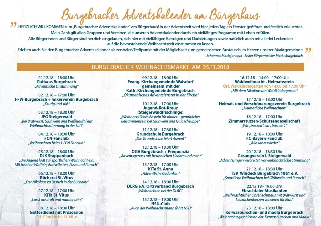 Das erste Fenster wird in diesem Jahr vom Rathaus Burgebrach gestaltet. Unter dem Titel „Adventliche Einstimmung“ sind am Samstag, 01. Dezember 2018, ab 18 Uhr alle Bürgerinnen und Bürger herzlich willkommen.