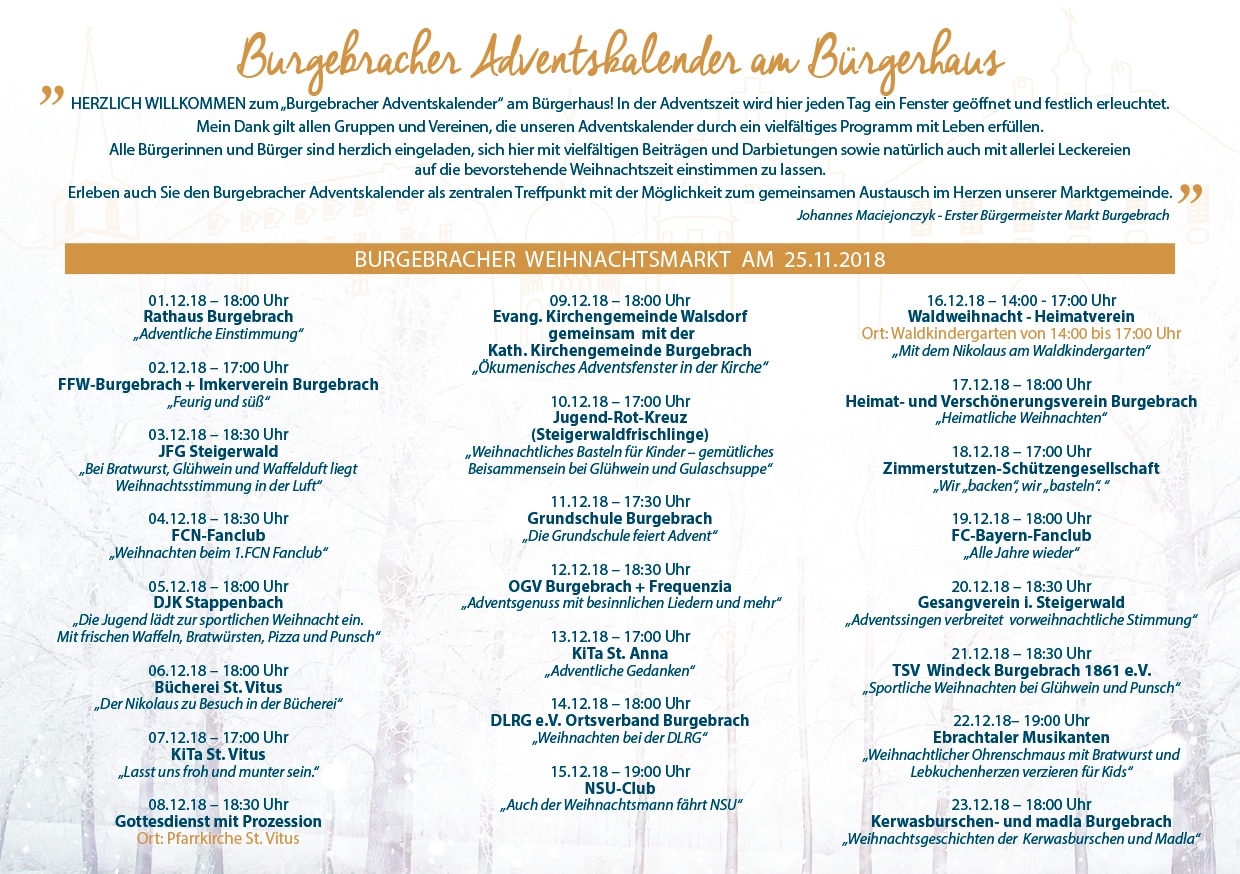 Das erste Fenster wird in diesem Jahr vom Rathaus Burgebrach gestaltet. Unter dem Titel „Adventliche Einstimmung“ sind am Samstag, 01. Dezember 2018, ab 18 Uhr alle Bürgerinnen und Bürger herzlich willkommen.