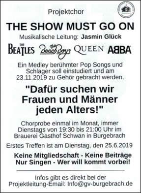 Der Vorsitzende des Gesangvereins Jürgen Schmitt und die Mitglieder des Vereinsvorstandes vom Gesangverein im Steigerwald Burgebrach e.V. haben gemeinsam die Idee entwickelt, einen neuen Projektchor zu gründen: „The Show must go on wurde aus der Taufe gehoben“. Singbegeisterte aus Burgebrach und den umliegenden Gemeinden sollen für ein unverbindliches Mitwirken begeistert werden. Der Verein freut sich auf diese „Mitmachaktion für alle“.