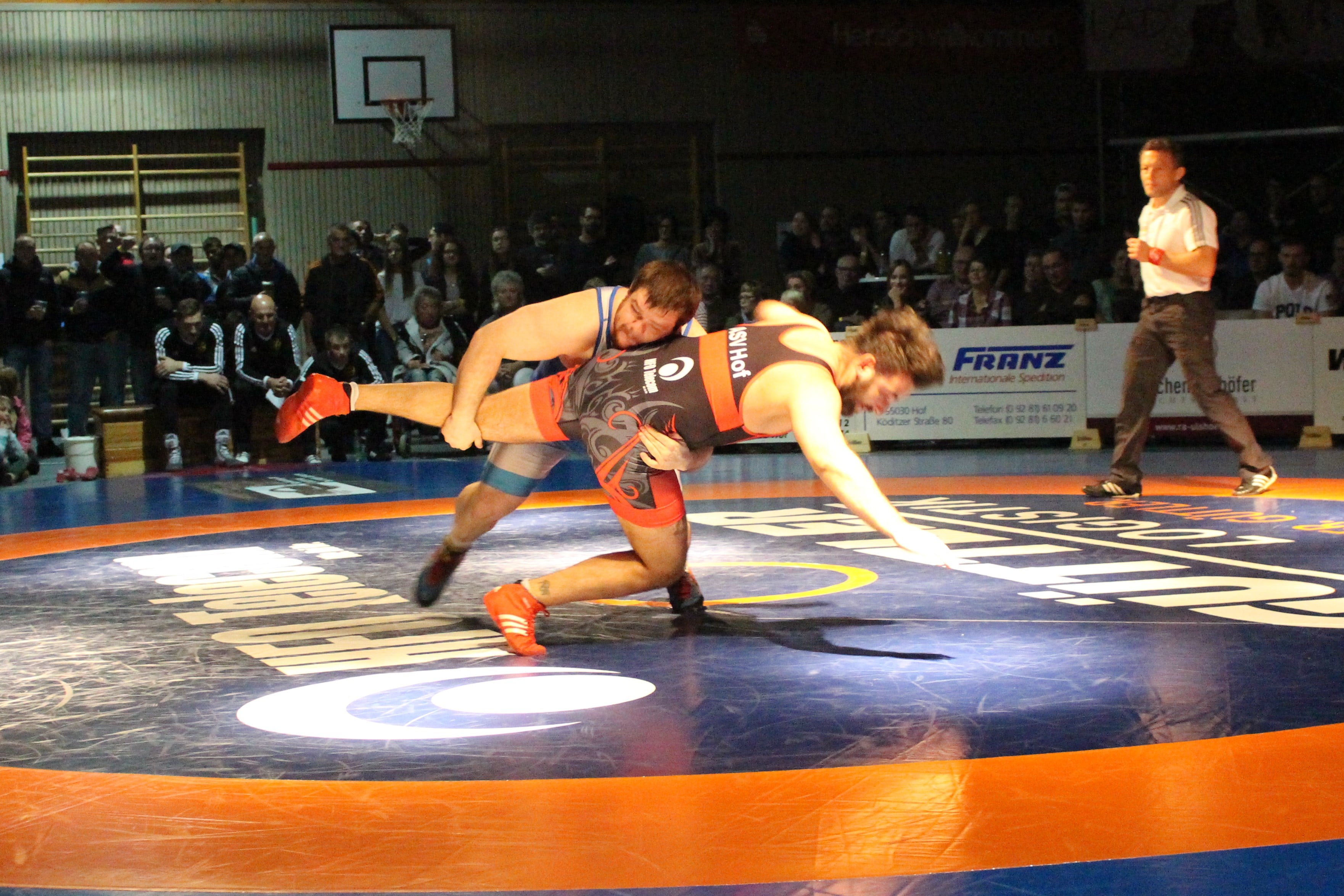 Bild: Jens Brosowski beherrscht die Schwergewichtsklasse auch in Hof. Gegen Kai Schramm gewinnt er durch Überlegenheit. Mit diesem Beinangriff punktet er. Am Ende vier wichtige Punkte für den 19:13 Gesamtsieg des TSV.