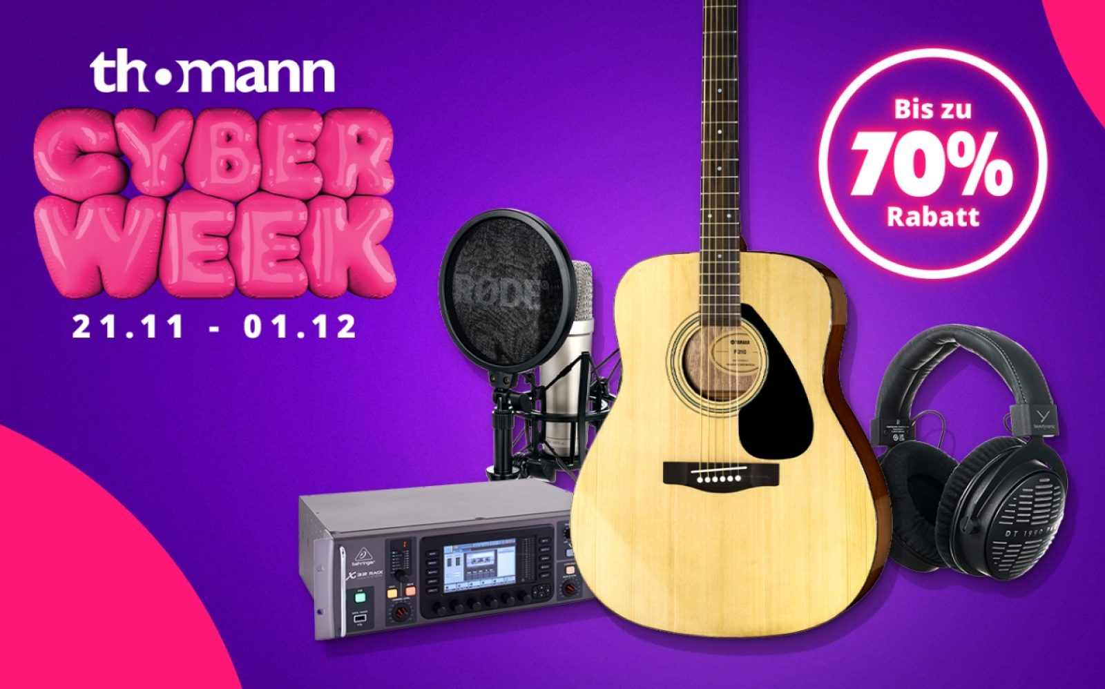 Vom 21. November bis einschließlich 01. Dezember läuft die offizielle Cyberweek von Thomann mit Angeboten bei Gitarren und Synthesizern bis hin zu Mikrofonen und Studio-Software. Top-Marken wie RØDE, Fender, Taylor, Sennheiser, Behringer und PRS bieten exklusive Preisnachlässe.