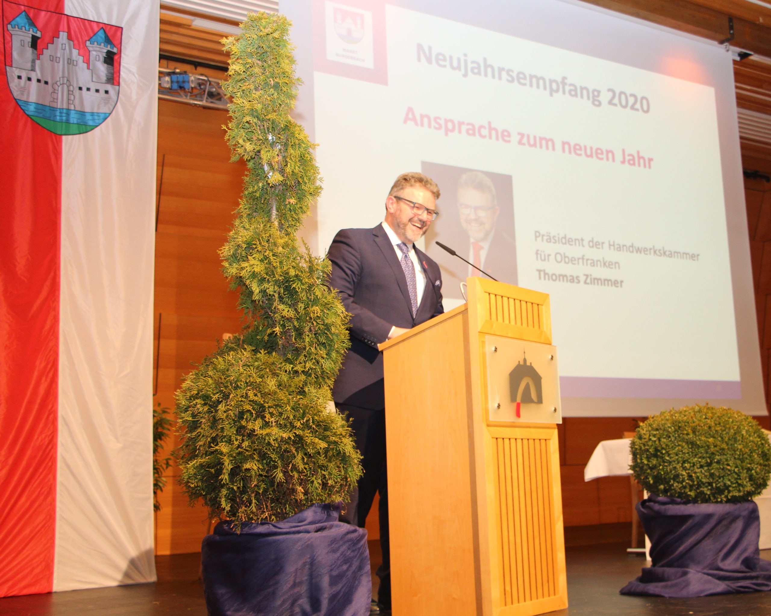 Als Festredner konnte diesmal der Präsident der Handwerkskammer für Oberfranken Thomas Zimmer gewonnen werden. Dieser freute sich über die Wertschätzung des Handwerks, welches ja auch in Burgebrach stark vertreten ist. Er zeigte auf, dass in den vergangenen Finanzkrisen verschiedene Industriebetriebe viele Menschen entlassen mussten. Deutschland wurde verschont, weil das Land auch vom Mittelstand geprägt ist und dadurch eine größere wirtschaftliche Stabilität vorhanden sei. Nachhaltigkeit werde in den Handwerksbetrieben groß geschrieben. Die kleinen, oft inhabergeführten Betriebe handeln schon immer nachhaltig, sei es durch ständige Aus- und Weiterbildung, die rechtzeitige Sorge um die Betriebsnachfolge, den kulturellen Erhalt und auch in der Ökologie. Als großen Erfolg sehe er die Wiedereinführung der Meisterpflicht in zwölf Gewerken, dadurch sei auch die qualifizierte Ausbildung der nachfolgenden Generationen wieder gewährleistet. Mit Zuversicht und vollen Auftragsbüchern gehe das Handwerk wieder in das neue Jahr, wenngleich auch bürokratische Hürden – wie beispielsweise die eingeführte gesetzliche Bonpflicht – „gemeistert“ werden müssen.