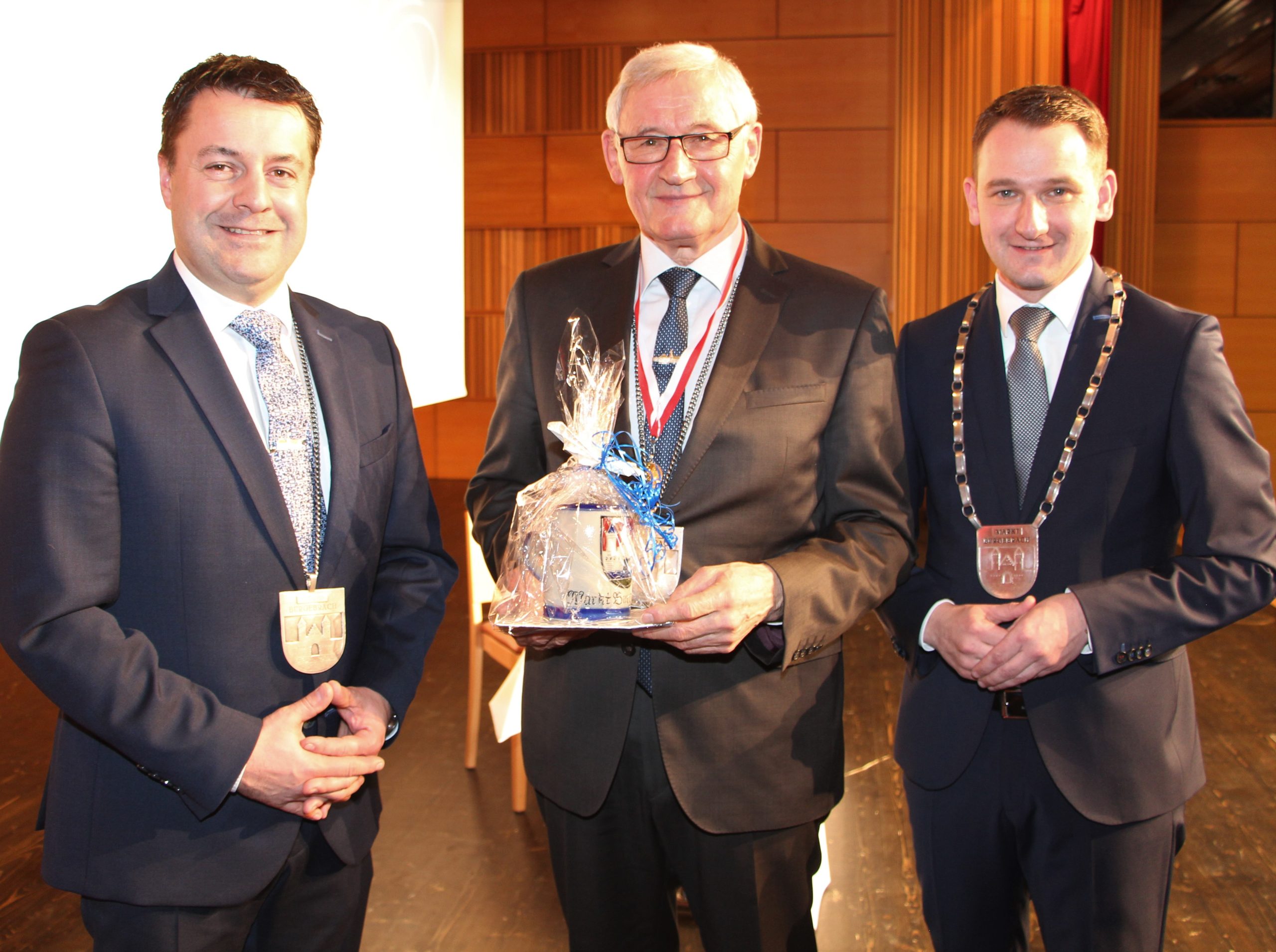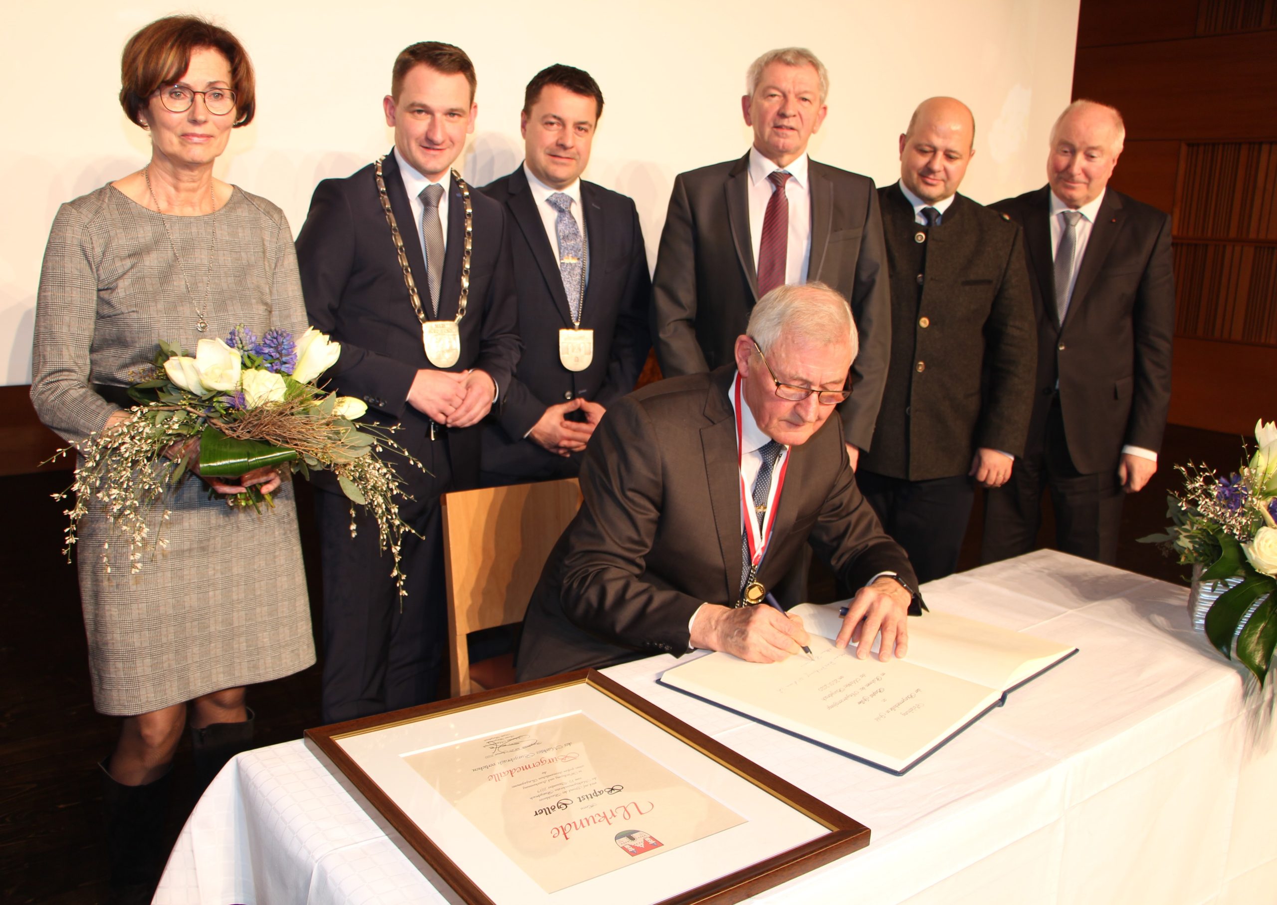Der Höhepunkt des Abends war dann die Verleihung der Bürgermedaille an Baptist Göller. Erster Bürgermeister Maciejonczyk zeigte neben seinem beruflichen Werdegang auch die unendlich vielen langjährigen und verschiedenartigen ehrenamtlichen Tätigkeiten von Baptist Göller auf. Hervorzuheben ist das 30-jährige Wirken als Marktgemeinderat, davon 18 Jahre als 3. Bürgermeister und seine 12-jährige Mitgliedschaft im Kreisrat. Baptist Göller engagierte sich in vielen Vereinen auch in der Vorstandschaft: in Sportvereinen, im Ortskulturring, in der Feuerwehr, im Heimatverein und der Trachtengruppe, bei den Ebrachtaler Musikanten, bei der KAB usw. Auch im kirchlichen Bereich war und ist er noch heute sehr engagiert. 40 Jahre lang war er Pfarrgemeinderat – heute ist er noch Beauftragter für die Erwachsenenbildung und fungiert auch noch als „Oldie-Ministrant“. Als Anerkennung seiner Verdienste überreichte der Bürgermeister die Bürgermedaille des Marktes Burgebrach mit einer Urkunde, wofür die Gäste lange applaudierten. Im Anschluss hat er sich zusammen mit dem Ersten Bürgermeister Maciejonczyk, zweiten Bürgermeister Peter Pfohlmann, dem Altbürgermeister Georg Bogensperger, Landrat Johann Kalb und MdL Holger Dremel in das Goldene Buch eingetragen.