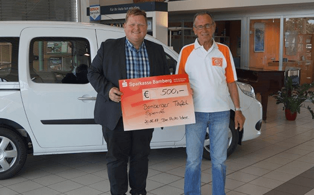 Die Tafel aus Bamberg sammelt Lebensmittel und verteilt diese an Bedürftige aus der Region, um sein soziales Engagement für diese wertvolle Arbeit auszudrücken, unterstützt die Auto Idee e. K. aus Burgebrach die Bamberger Tafel mit einer Spende. Der Inhaber Dieter Hümmer überreicht Herrn Zimmer von der Bamberger Tafel einen Scheck in Höhe von 500 €.