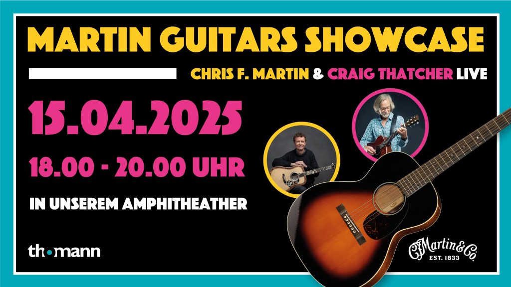 Chris F. Martin, Geschäftsführer von Martin Guitars, und der hochvirtuose Gitarrist Craig Thatcher sind am 15. April 2025 exklusiv bei Thomann zum öffentlichen Interview zu Gast 🎸 Möchtest auch du einen Blick hinter die Kulissen der legendären Gitarrenschmiede werfen, komm um 18:00 Uhr zum Event in unser Amphitheater. Du hast die Chance ein Give-Away zu erhalten!