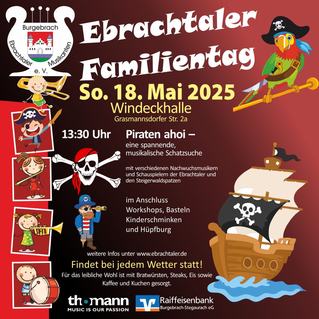 Die Nachwuchsmusikerinnen und Musiker präsentieren direkt zu Beginn in der Windeckhalle eine spannende, musikalische Schatzsuche mit dem Titel: Piraten ahoi! Unterstützt werden sie hierbei von einigen Schauspielern aus verschiedenen Gruppen der Ebrachtaler und vom Kinderchor Steigerwaldspatzen.