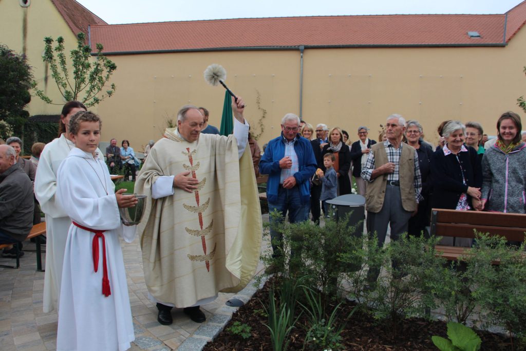 Burgebrach. Nach einem Festgottesdienst in der Pfarrkirche St. Vitus mit Generalvikar Georg Kestel sind die Gläubigen mit den Ehrengästen und den Vereinen mit ihren Fahnenabordnungen in Begleitung der Ebrachtaler Musikanten in den neugestalteten Pfarrgarten in Burgebrach eingezogen. Dort gab der Generalvikar zunächst dem neu sanierten Pfarrhaus und anschließend dem Pfarrgarten den kirchlichen Segen in Begleitung von Domkapitular Dr. Norbert Jung, Dekan Albert Müller, Pfarrer Ewald Thoma und dem örtlichen Pfarrer Bernhard Friedmann.