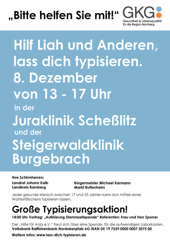 Gemeinsam mit dem Verein „Hilfe für Anja e.V“ wird eine Typisierungsaktion im November in Buttenheim durchgeführt. Für alle, die nicht nach Buttenheim kommen können bietet die Gemeinnützige Krankenhausgesellschaft ebenfalls mit dem Verein „Hilfe für Anja e.V.“ eine