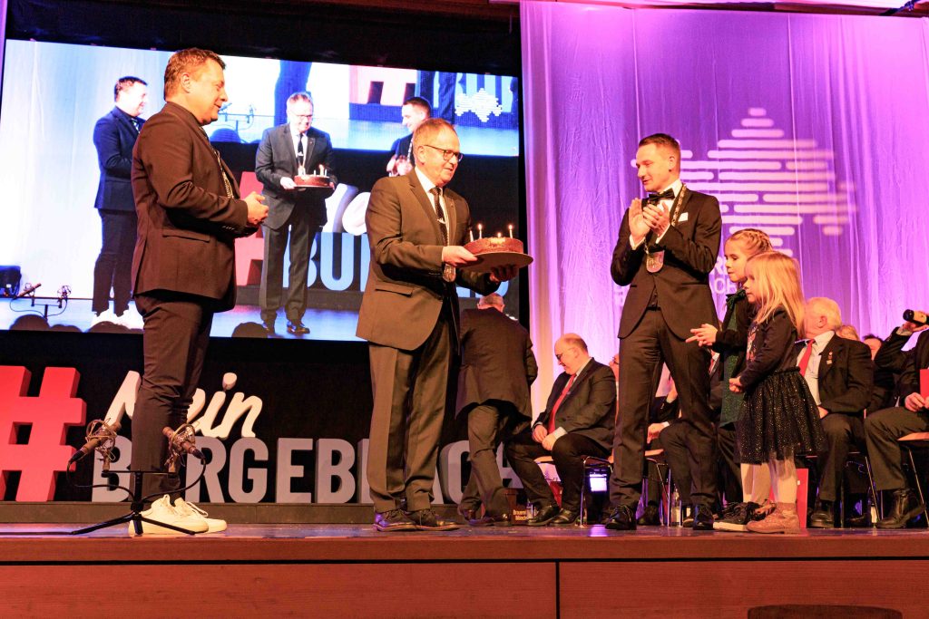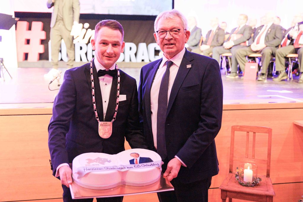 Mit einem Geburtstagsständchen und einer Torte überraschte das Publikum den Landrat Johann Kalb zu Beginn seiner Rede. „Burgebrach packt an, nimmt sein Schicksal in die Hand“. Burgebrach zeige sich jung, attraktiv, innovativ und leistungsstark.