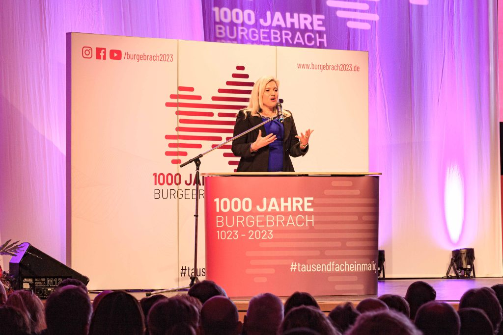 Die Staatsministerin Melanie Huml hob in ihrer Festrede das große Gemeinschaftsgefühl und die vielen Versorgungsangebote für alle Generationen im Gemeindebereich hervor. „In einer der schönsten Kulturlandschaften Europas lässt es sich gut leben und arbeiten“, so die Ministerin. „Burgebrach hat einfach alles, hat immer gute Ideen. Macht bitte weiter so, dann wird mir nicht bange um die nächsten 1000 Jahre. “