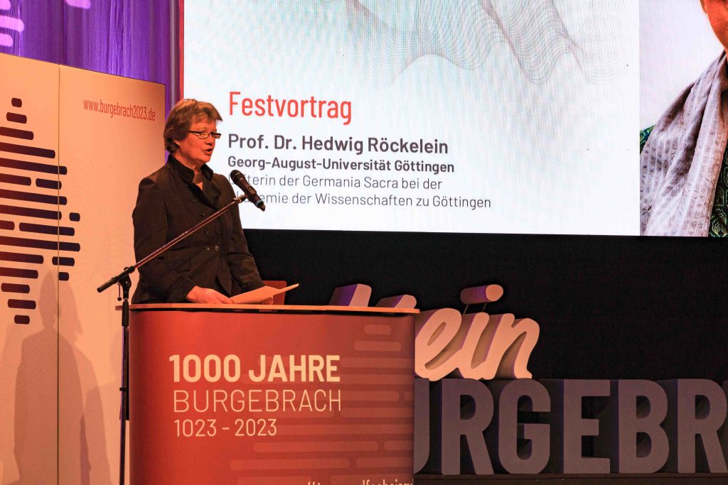 Prof. Dr. Hedwig Röckelein, eine der insgesamt 16 Autoren der neuen Chronik, beglückwünschte die 27 Gemeindeteile des Marktes Burgebrach für ihr Überleben. Verschwanden doch im 14. Jahrhundert durch Pest und Krieg 110 Siedlungsgebiete komplett aus dem Umkreis von Burgebrach. Die erste Nennung der Orte Burgebrach und Ampferbach belegt eine Urkunde vom 2.9.1023, in der Kaiser Heinrich II einen
