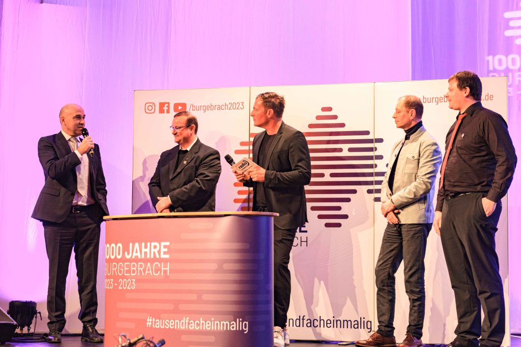 In der ersten Talkrunde spiegelte die Regierungspräsidentin von Oberfranken, Frau Heidrun Piwernetz, Freude und Begeisterung für die Jubiläumsgemeinde wider. Burgebrach zeichne seine Zentralität für ein Umfeld von rund 17000 Menschen aus. Hans Thomann, Chef der Fa. Thomann, Treppendorf, sei mit seiner Firma in einem kleinen Dorf immer noch im Aufbau – er liebt Kräne. Seinem Wunsch nach einem näheren Flugplatz konnte Udo Kunzmann, Geschäftsführer der Gemeinnützigen Krankenhausgesellschaft (GKG) nur teilweise befriedigen – er verwies auf seinen Hubschrauberlandeplatz an der Steigerwaldklinik. Die Gesundheitsversorgung sei in Burgebrach mit der Steigerwaldklinik, den medizinischen Einrichtungen und dem Seniorenheim ausgezeichnet und d für die Zukunft gesichert, so Udo Kunzmann weiter. Die Rahmenbedingungen für die 90 angesiedelten Handwerksbetriebe mit ihren rund 850 Mitarbeitern seien gemäß Leo Voran, Innungsmeister der Kreishandwerkerschaft, in Burgebrach sehr gut.