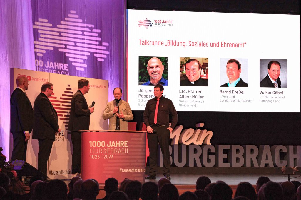 In der zweiten Talkrunde zeigte sich Schulleiter Jürgen Poppendörfer begeistert hinsichtlich der vorhandenen Ausstattung in der Mittelschule. Seelsorgebereichsleiter Albert Müller bescheinigte ein gutes Zusammenwirken zwischen Politik und Kirche. Bernd Dreßel, Vorstand der Ebrachtaler Musikanten, zeigte sich zunächst sehr zufrieden mit seinem Auftritt des Quintetts seiner Kapelle. Die Unterstützung der Vereine durch den Markt Burgebrach sei sehr gut. Volker Göbel, Geschäftsführer des Caritasverbandes für den Landkreis Bamberg, unterhält in Burgebrach die Tagespflege, die ambulante Versorgung und die Mittagsbetreuung an der Grundschule. Die Zusammenarbeit mit dem Markt Burgebrach sei sehr einvernehmlich.