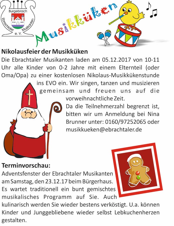 Die Ebrachtaler Musikanten laden am 05.12.2017 von 10-11 Uhr alle Kinder von 0-2 Jahre mit einem Elternteil (oder Oma/Opa) zu einer kostenlosen Nikolaus-Musikkükenstunde ins EVO ein.