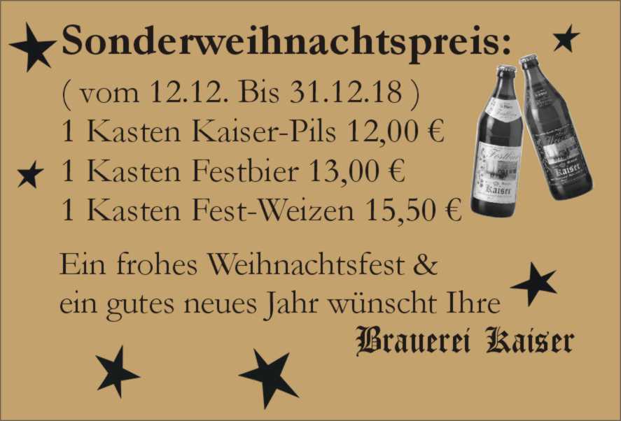 Wer sich also zum festlichen Schmaus noch ein gutes Bier gönnen möchte, kann sich bei der Brauerei Kaiser den einen oder anderen Kasten zum Weihnachtspreis besorgen!