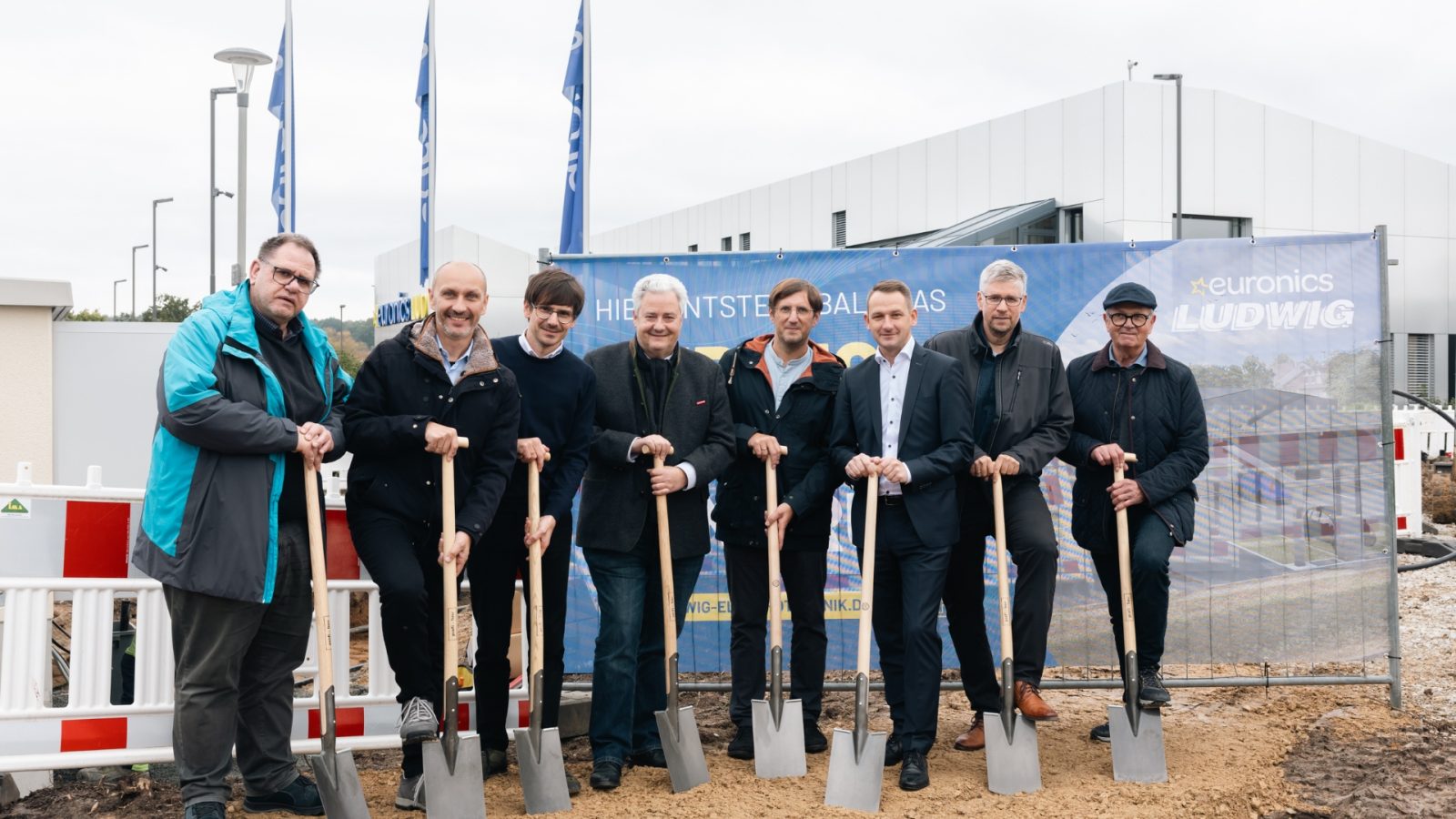 v.li.n.re : Markus Köhler (Bauunternehmen Köhler), Michael Seidenath (Architekturbüro Eis Bamberg), Thomas Ludwig (Geschäftsführer der Ludwig elektro- und netzwerktechnik), Matthias Graßmann (Präsident der Handwerkskammer für Oberfranken), Markus Ludwig (Geschäftsführer der Ludwig elektro- und netzwerktechnik), Johannes Maciejonczyk (erster Bürgermeister Burgebrach), Rainer Keis (Wirtschaftsförderung Landratsamt Bamberg), Peter Ludwig (Ludwig elektro- und netzwerktechnik) beim Spatenstich