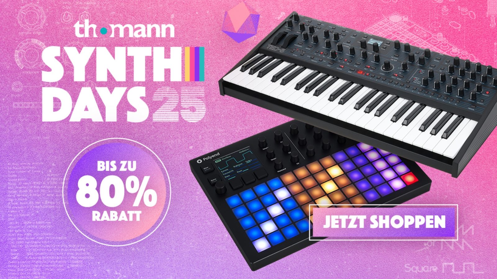 Treppendorf, 8. Mai 2025 –Pünktlich zur Superbooth 2025 in Berlin startet Thomann mit 100 Deals rund um Synthesizer, Drumcomputer und Groove-Boxes in die Synth Days. Bis zu 80 % Rabatt warten ab sofort auf Synthesizer-Enthusiasten, Klangkünstler und Studiotüftler.