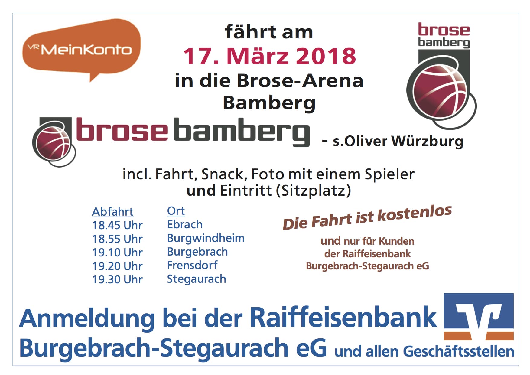 Der VR-MeinKonto-Club fährt am Samstag, 17. März 2018, zum Spiel Brose Bamberg vs. s.Oliver Würzburg in die Brose-Arena Bamberg. Die Fahrt ist kostenlos und nur für Kunden der Raiffeisenbank Burgebrach-Stegaurach eG buchbar. Neben Hin- und Rückfahrt erhalten alle Teilnehmer auch kostenlosen Eintritt (Sitzplatzkarte), einen Snack sowie ein Foto mit einem Spieler.